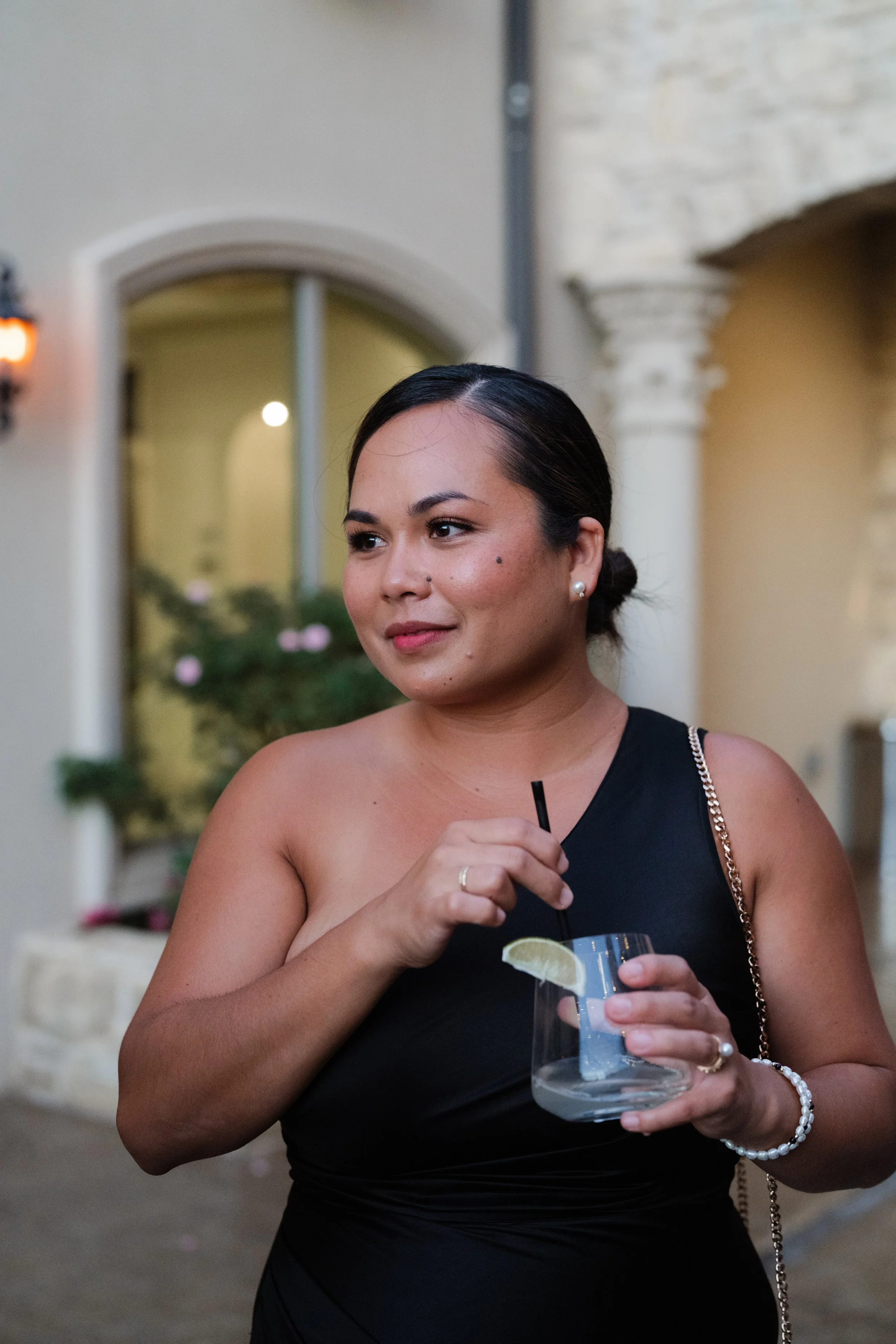 A woman in a black one-shoulder dress holding a drink with a lime wedge, standing in an indoor setting with classic architecture and soft lighting.