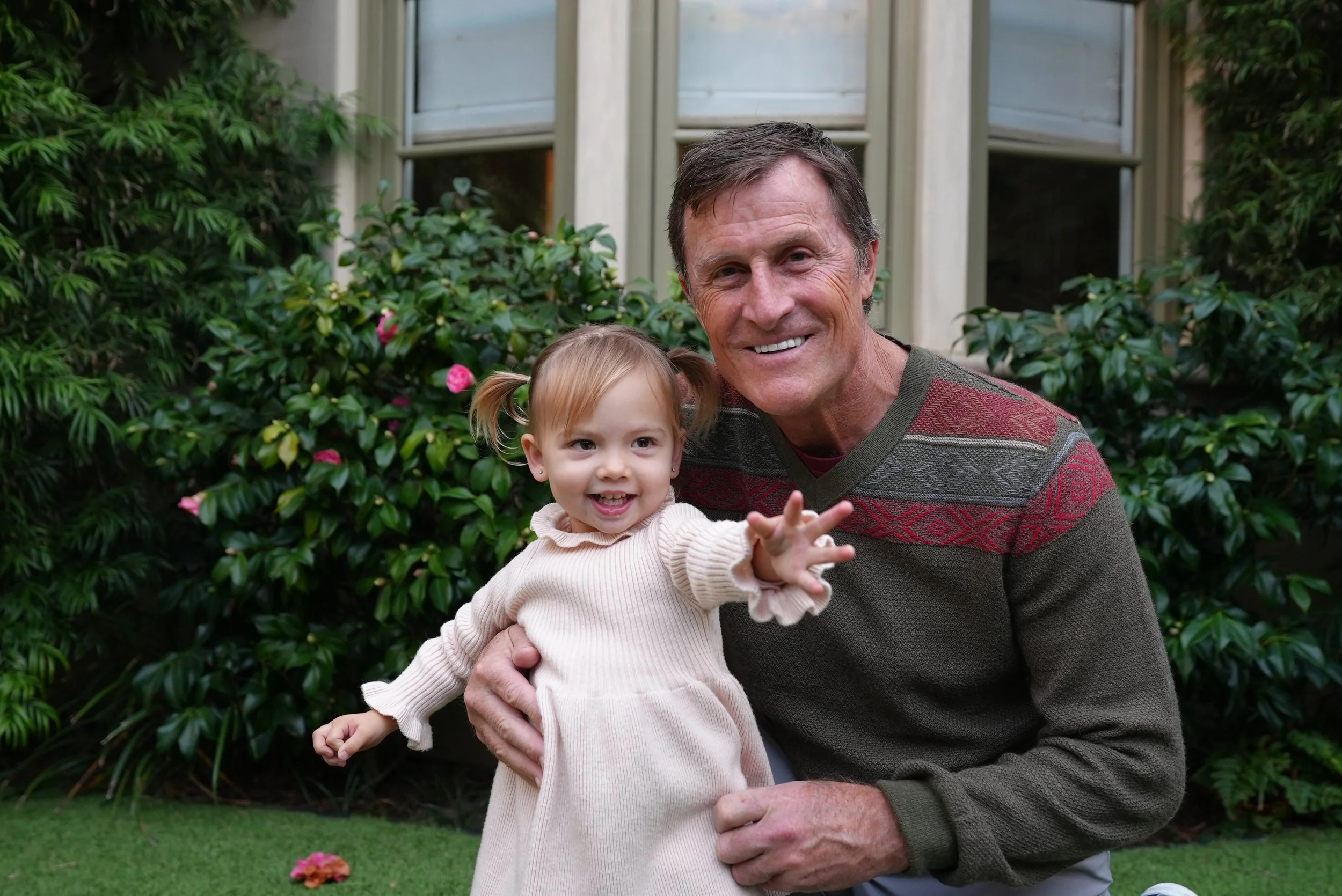 A smiling older man crouching next to a young girl with pigtails, both outside in a garden with green bushes and a house window in the background.