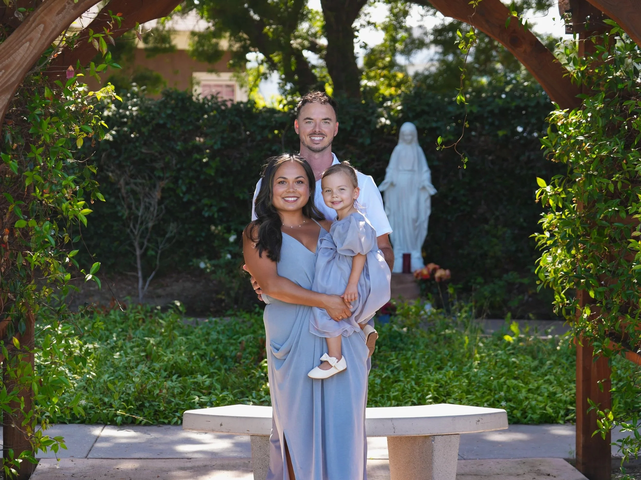 A family of three, a man, woman, and young girl, smiling and posing in a garden with a statue and greenery in the background.