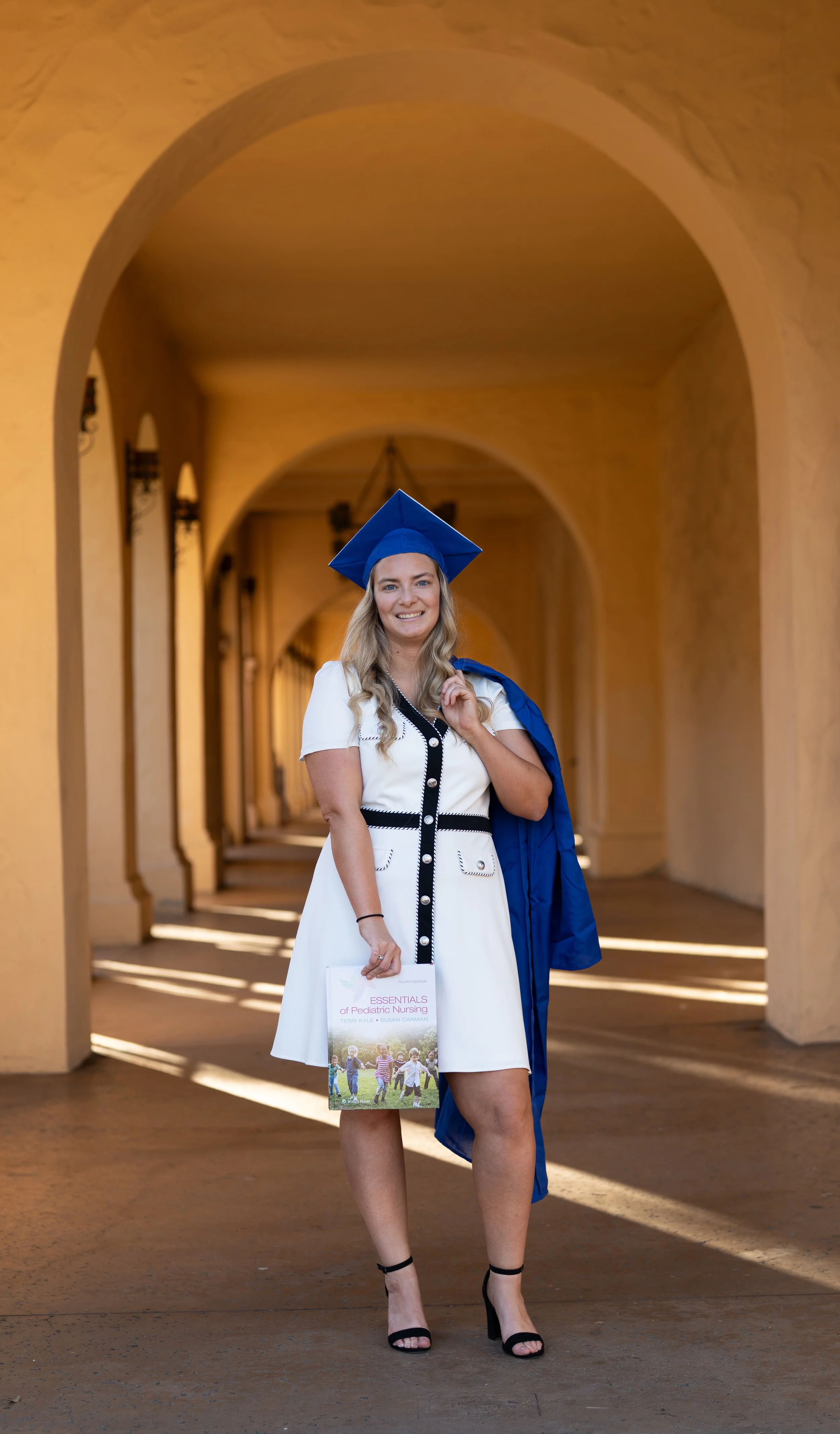 A woman in a white dress and blue graduation cap and gown standing in a hallway with arches, holding a book and smiling.
